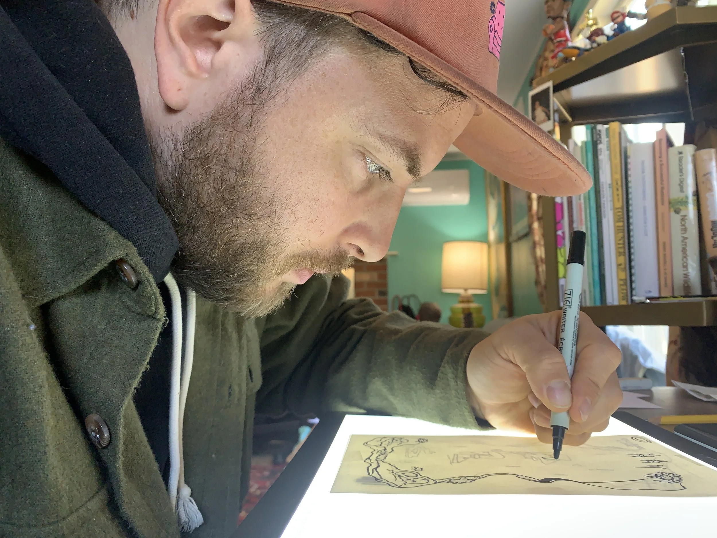 My background is in graffiti and that was my first education on letters and characters. Through my college years I worked as a chalkboard artist at Trader Joe’s, another informal education into color, signage, and retail design. I am an illustrator who specializes in cartoons, characters, and bright colors, doing digital illustration, paintings, and murals. I have a dream job doing graphics at Nike, but am always active in art shows and keeping my painting alive.
